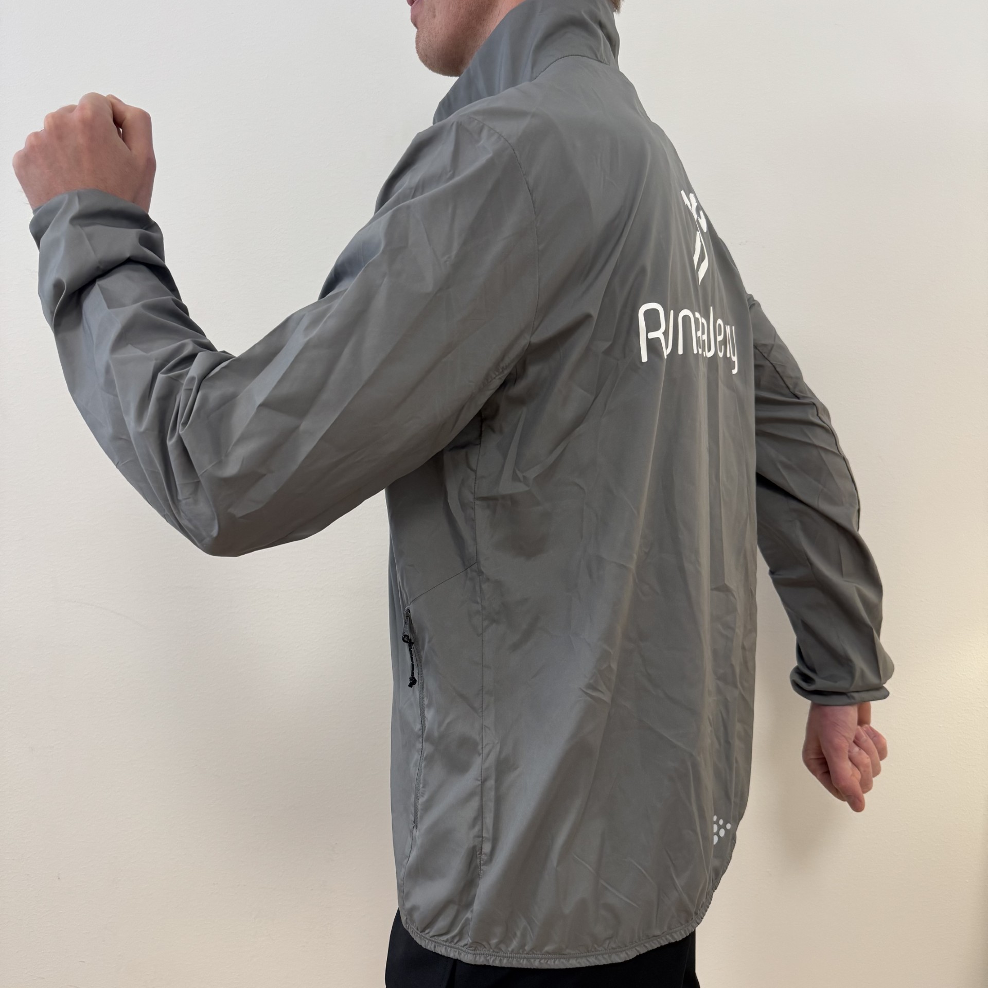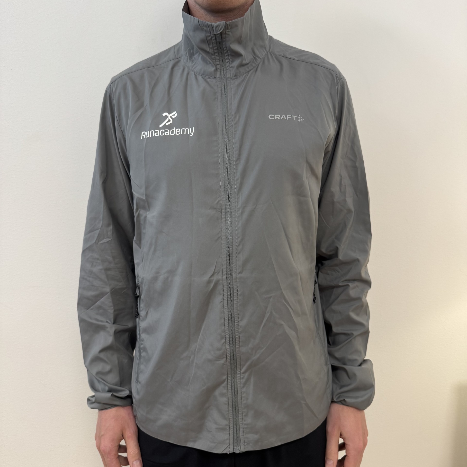 En vindtät träningsjacka gjord i ett tunt funktionsmaterial som ger bra fukttransport. Jackan har två sidfickor med dragkedja.